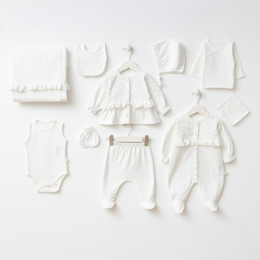 Un ensemble complet, raffiné et intemporel, idéal pour accueillir bébé avec élégance ou offrir un cadeau de naissance plein de tendresse.